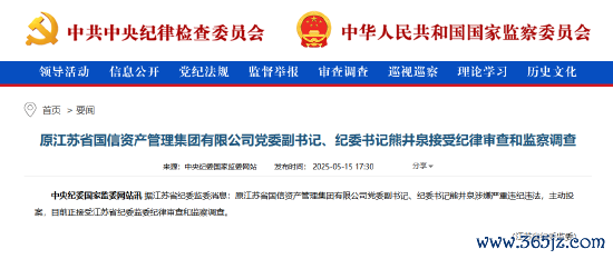 5月15日金融一线消息,据江苏省纪委监委消息:原江苏省国信资产管理集团有限公司党委副书记、纪委书记熊井泉涉嫌严重违纪违法,主动投案配资软件,目前正接受江苏省纪委监委纪律审查和监察调查。